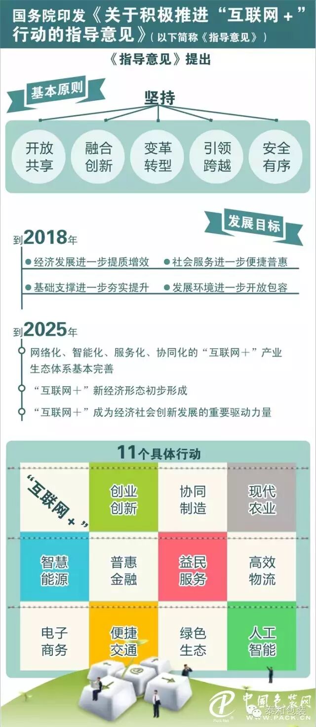 国务院印发推进“互联网+”行动意见 锁定11大重点领域发表时间:2015-07-17 13:38 核心提示:星期六。你或许还在休息,但国务院一点都没闲着。这一天,《国务院关于积极推进“互联网+”行动的指导意见》正式公开发布。这一文件的发布,将意味着“互联网+”正式从概念上升为国家行动,你的生活也将随之被深刻改变。 【中国包装网讯】星期六。你或许还在休息,但国务院一点都没闲着。这一天,《国务院关于积极推进“互联网+”行动的指导意见》正式公开发布。这一文件的发布,将意味着“互联网+”正式从概念上升为国家行动,你的生活也将随之被深刻改变。